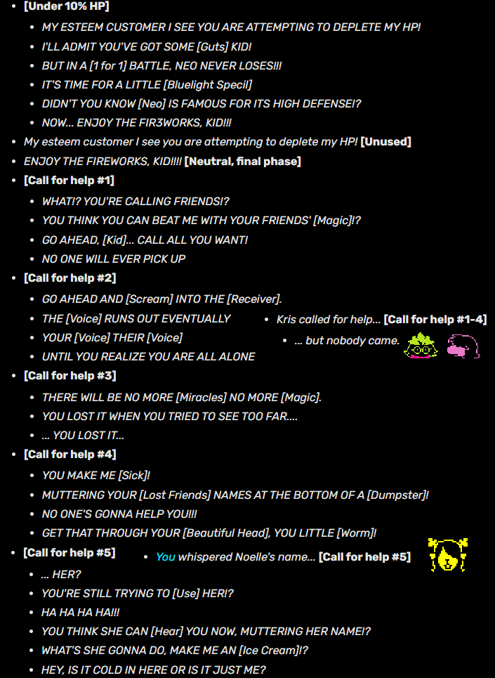 Verso la fine della battaglia, Spamton la mette in stallo usando la funzione più famosa del corpo NEO, la sua invincible difesa (proprio come Mettaton NEO nella geno di UT…?). Kris non può fare altro che chiamare aiuto, prova a chiamare Susie senza successo, prova a chiamare Ralsei senza successo, e infine noi sussurriamo il nome di Noelle e… in uno schermo nero sentiamo solo il suono familiare di IceShock, con dei numeri gialli a schermo che indicano danni altissimi. Nel silenzio e nel buio la fontana viene quindi sigillata.