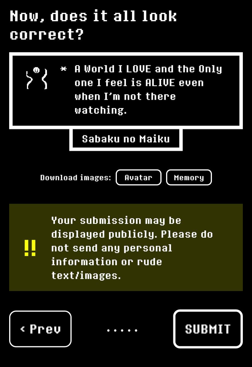 Concludiamo con una cosa bella: ricordi come per il decimo anniversario del gioco, Toby aveva invitato i fan a scrivere le proprie memorie in un fiore Eco, insieme alla possibilità di fare un disegnino? Sono riapparsi nelle due live speciali dell'anniversario; il tuo non è apparso, sono stato a cercare il mio e di un amico, ma più di 400.000 persone hanno partecipato, quindi era praticamente una lotteria... le memorie appaiono sia durante gli intervalli della live, ma anche nella fight finale contro Asriel, dove tutti "insieme" salviamo Asriel e il mondo, quel tipo di cosa molto romantica che sono convinto apprezzerai.